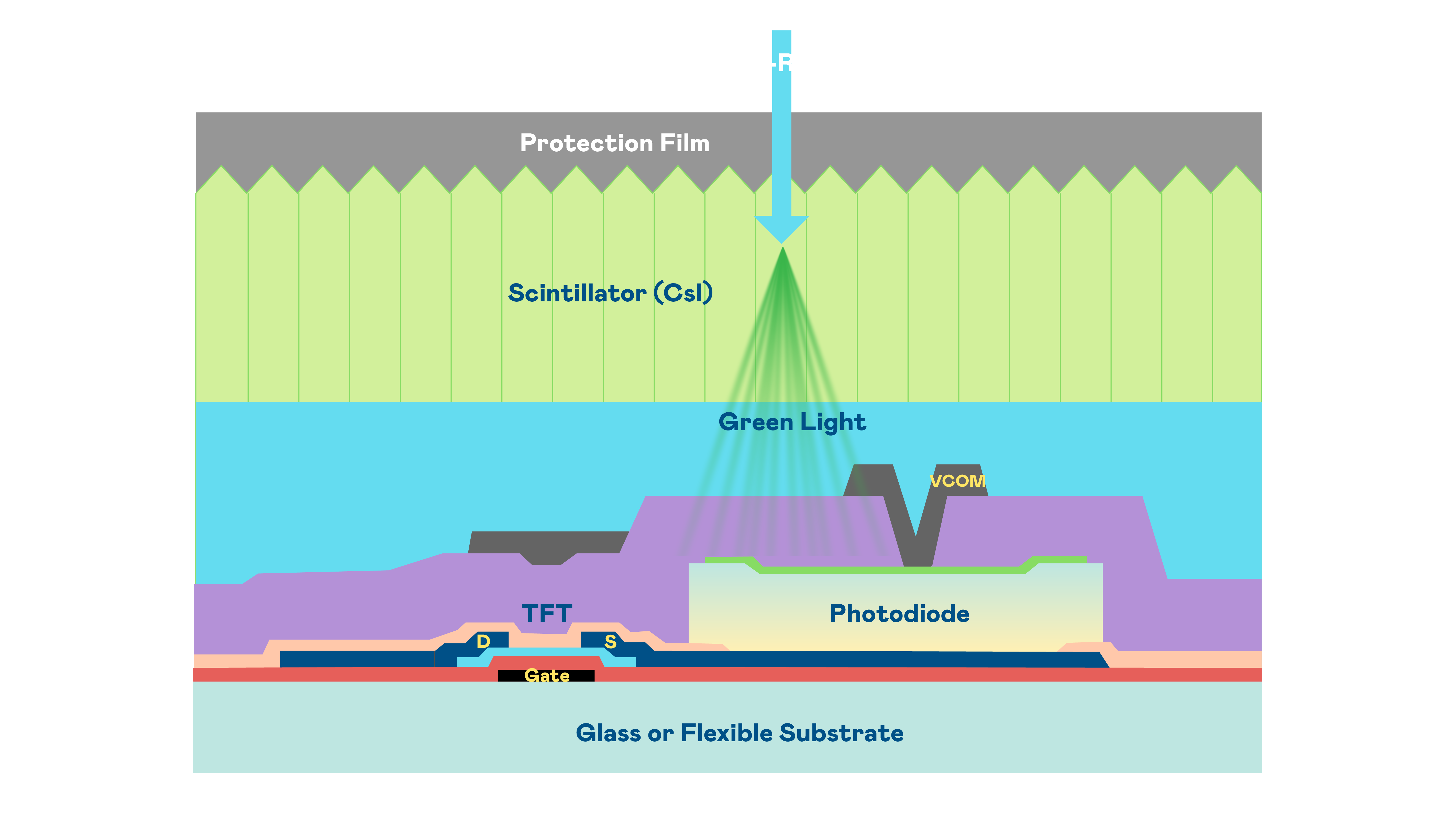 AG亚游的X光影像感测阵列使用薄膜电晶体 (TFT) 作为每个像素的读取开关,搭配光电二极体(Photodiode)的光电转换元件,用以感测X光影像讯号。